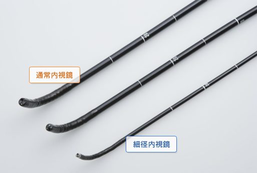 当院では「細径」の内視鏡を採用しています。一般的な内視鏡が8~9mm程度なのに対して、細径内視鏡は5~6mm程度。外径が細いことにより、患者さんの体に挿入した際の負担を最小限に抑えることができます。